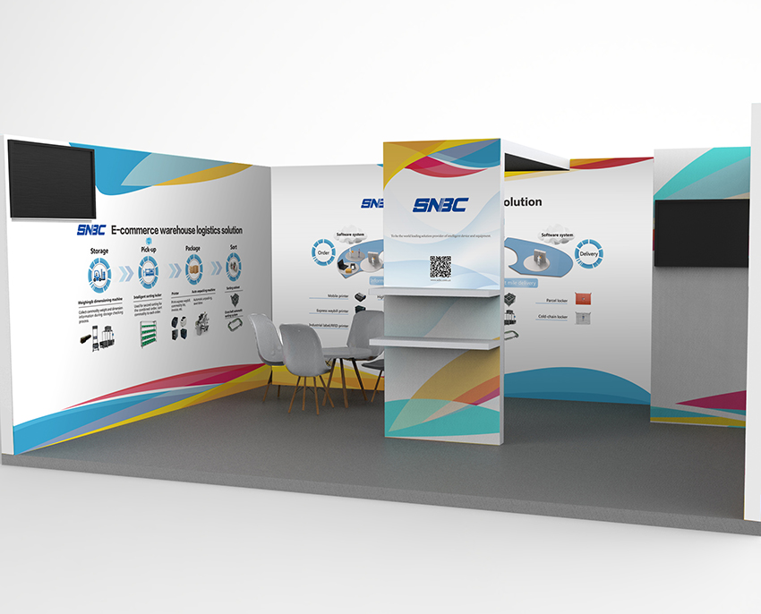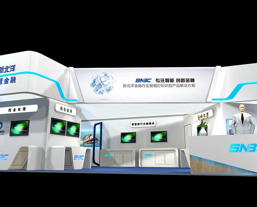 本公司為新北洋信息技術股份有限公司設計的展臺主要以藍白色調為主,白色調高端大氣,在以新北洋logo的標準藍的為輔,整體簡約大氣,展臺墻面則展示新北洋研發的新產品圖,更好的達到了對其產品的宣傳效果。