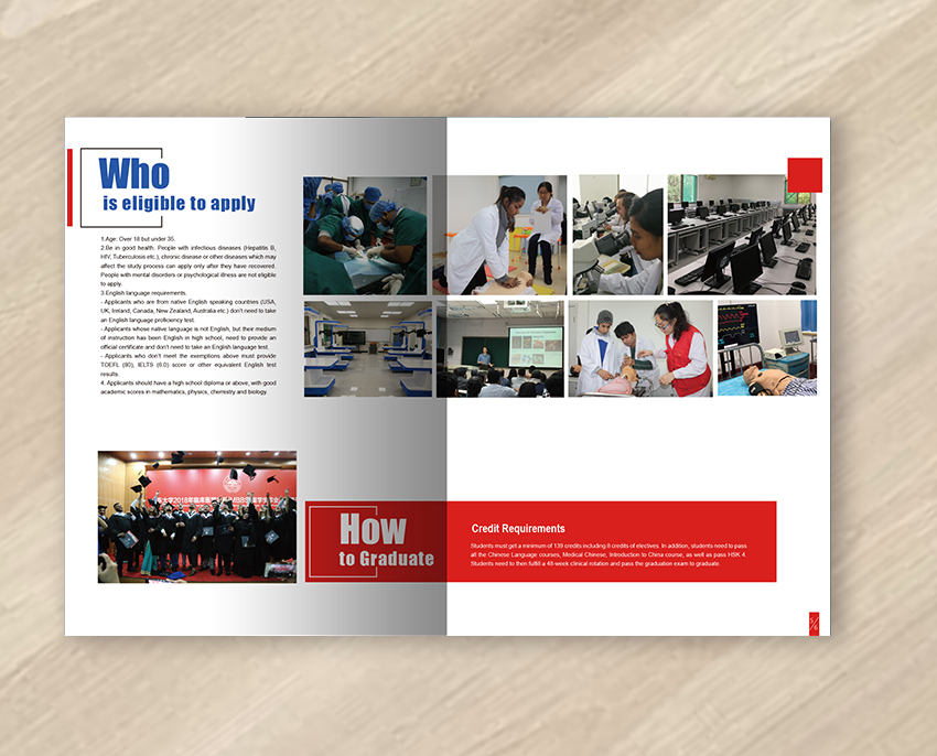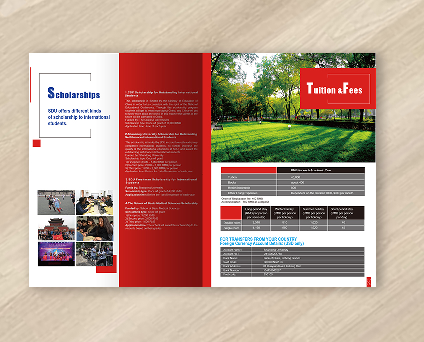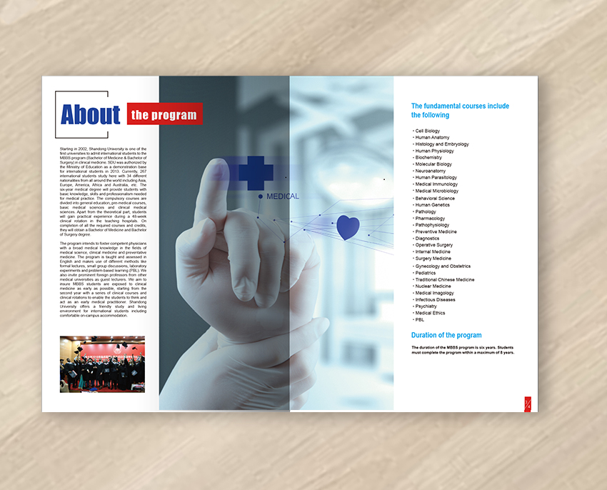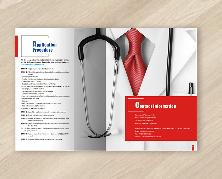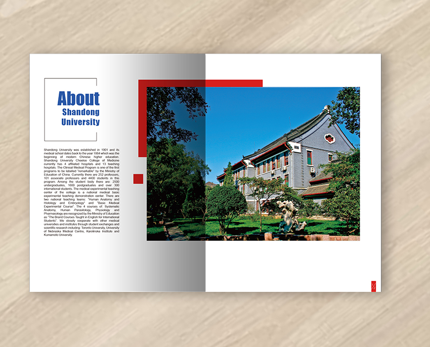 本設計為山東大學醫學院海外招生簡章,以山大紅為主色調,突出體現學校的悠久歷史、濃厚的學術氣息以及優雅的校園環境,整體設計簡單大氣、國際化。