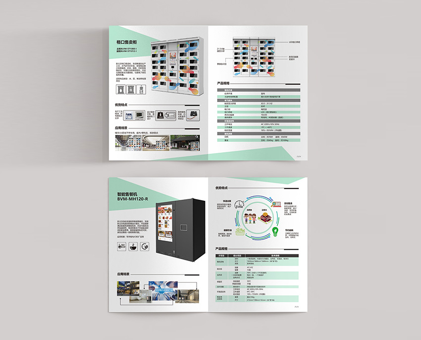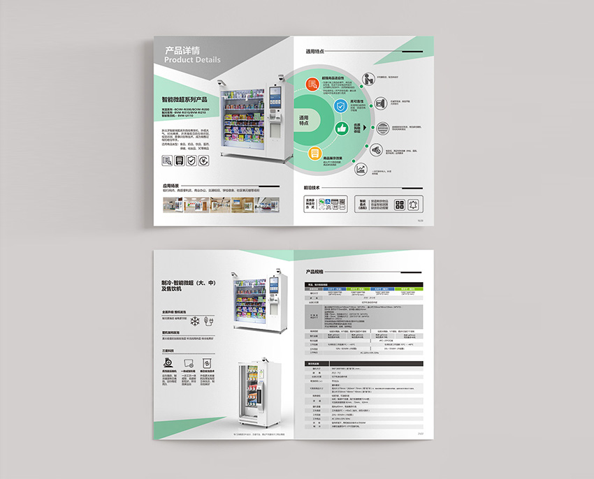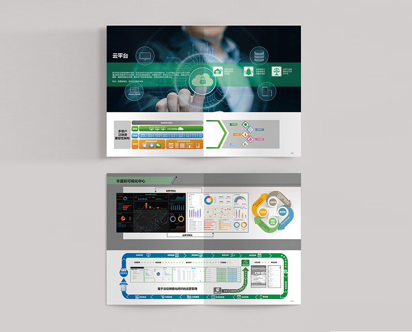 本次案例為新零售解決方案的畫冊設(shè)計,主色調(diào)運用淡綠色,場景結(jié)合結(jié)構(gòu)圖塊設(shè)計方式,使受眾能夠更加快速了解產(chǎn)品屬性及性能優(yōu)勢,簡潔大氣。